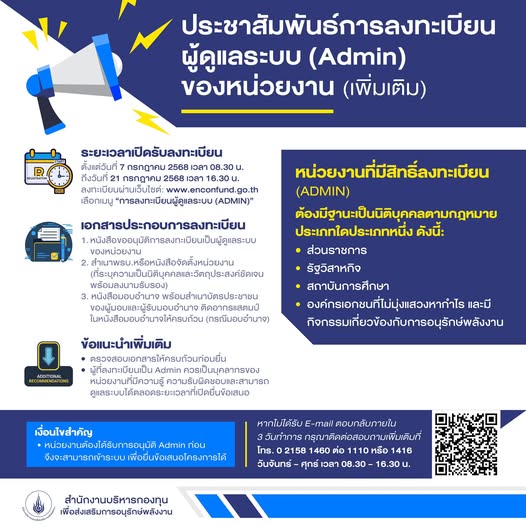 ประกาศ เรื่อง การยื่นลงทะเบียนผู้ดูแลระบบ (Admin) ของหน่วยงาน (เพิ่มเติม) เพื่อขอรับการสนับสนุนเงินกองทุนเพื่อส่งเสริมการอนุรักษ์พลังงาน ปีงบประมาณ พ.ศ. 2568