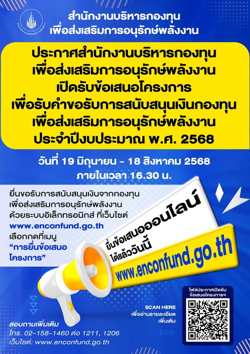 ขอเชิญหน่วยงานที่สนใจ ยื่นข้อเสนอโครงการเพื่อขอรับการสนับสนุนเงินกองทุนในการดำเนินงานด้านการอนุรักษ์พลังงาน