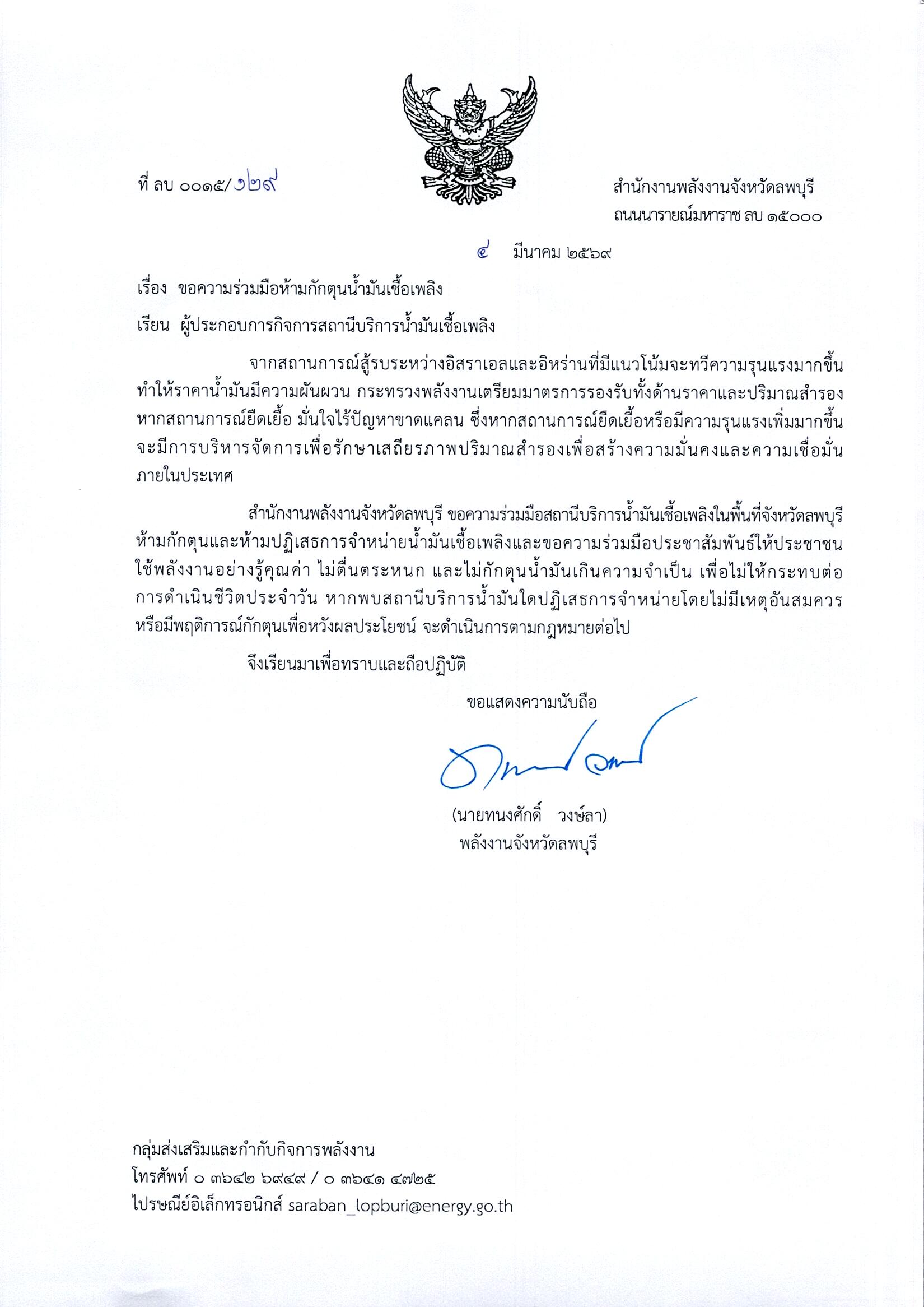 สำนักงานพลังงานจังหวัดลพบุรี "ขอความร่วมมือสถานีบริการน้ำมันเชื้อเพลิงห้ามกักตุนน้ำมัน และห้ามปฏิเสธการจำหน่ายน้ำมันเชื้อเพลิง"